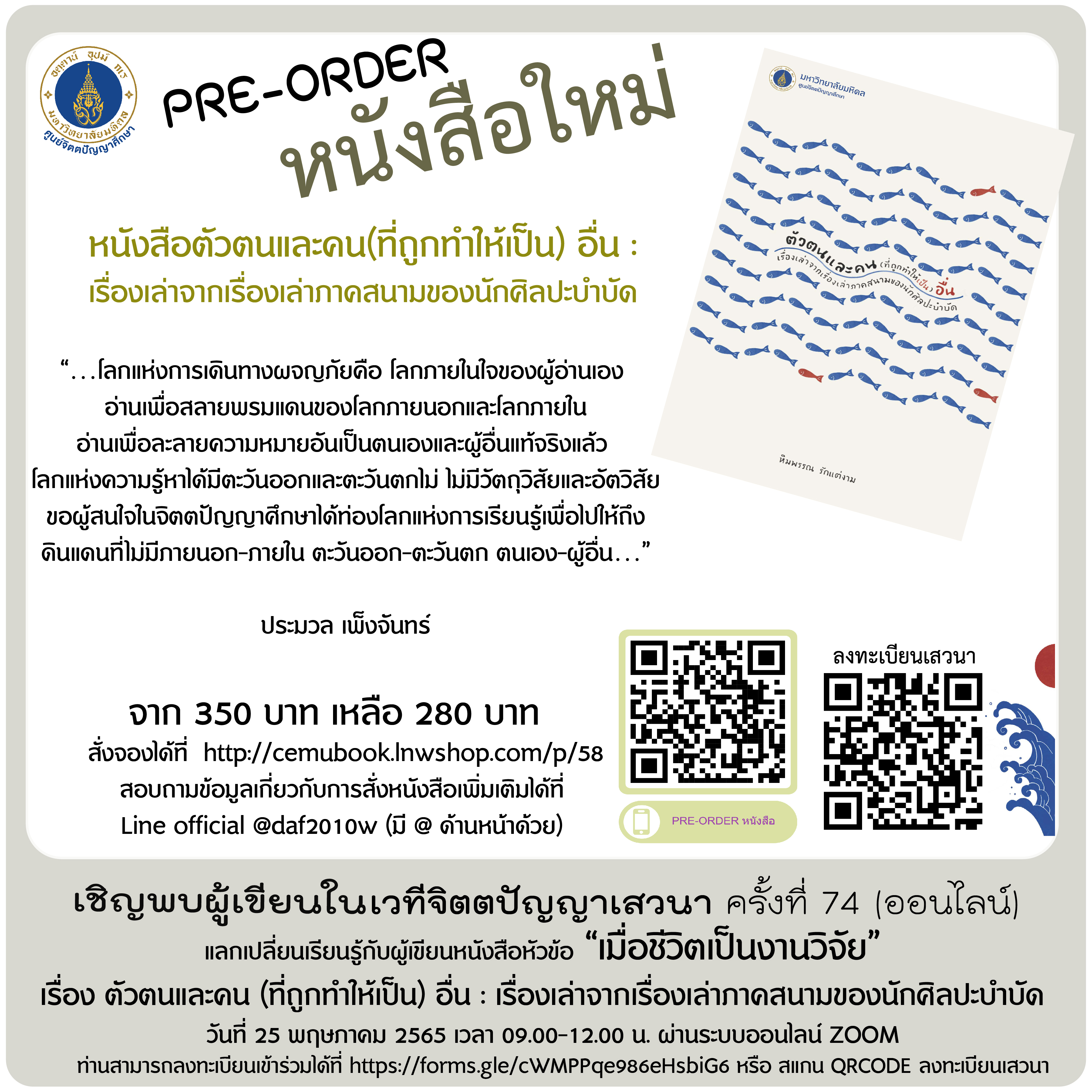 PRE-ORDER หนังสือ ตัวตนและคน (ที่ถูกทำให้เป็น) อื่น : เรื่องเล่าจากเรื่องเล่าภาคสนามของนักศิลปะบำบัด ซึ่งหนังสือเล่มนี้มี ที่มาจากงานวิจัยตนเอง การสืบค้นผ่านเรื่องเล่า (Narrative Inquiry) ในรูปแบบอัตชาติพันธุ์วรรณนา (Autoethnography Research)